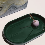 受け皿とお香たての色は、日本海と東シナ海に面した長崎県の青と、自然の緑、そしてサンドカラーからからインスパイアされています。