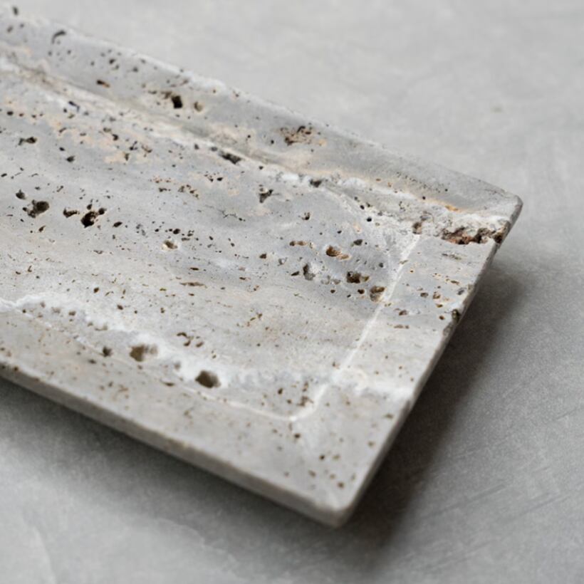 トラバーチンという大理石の一種から、一点一点手作業で作り出される重厚感あるトレイ。